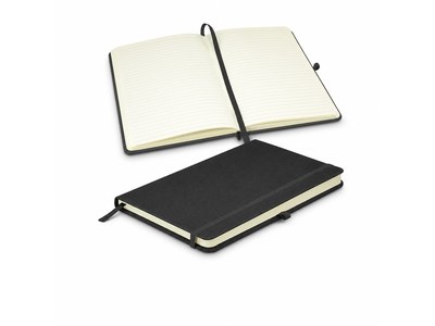 Sleek medium size custom notebooks with 80 leaves (160 pages) of 80gsm lined cream paper. It has a hard cover with a woven PU finish. Other features include an elastic closure band, a bookmark ribbon and a pen loop.