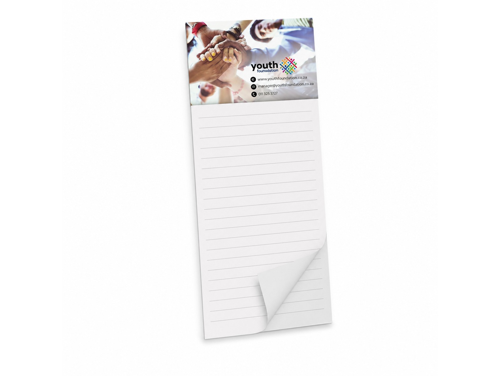 Affordable magnetic note pads which have 25 leaves on lined 70gsm paper with a magnetic holder that attaches to a fridge. The magnetic holder has a self-adhesive top section and a standard 90mm x 50mm business card can be easily attached to it to produce a highly effective DIY promotional product.