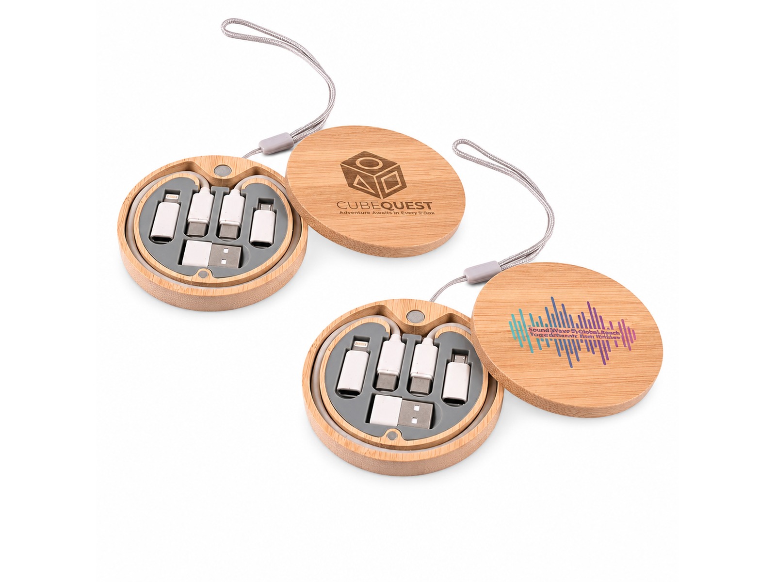 A chic, eco-friendly charging solution crafted with natural bamboo and wheat straw accents. This round bamboo charging cable sets features a magnetic lid that slides open effortlessly, revealing the essential charging components inside. A grey braided carry strap adds convenience and style. Beneath the lid, you'll find a Type C to Type C cable, along with Type A, Micro USB, and iOS connectors, ensuring compatibility with a wide range of devices. Both the cable and connectors are made from environmentally friendly wheat straw, and a grey insert in the base keeps everything securely in place. The charging Cable Sets combines functionality with sustainability, making it the perfect accessory for the eco-conscious tech enthusiast.