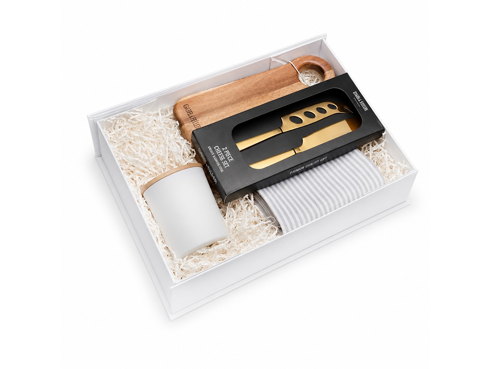 Create the perfect ambience for any occasion with our custom Home Decor Gift Sets. Perfect for corporate gifts, client appreciation, and promotional merchandise, this home entertaining collection combines an acacia serving board, gold cheese knives, vanilla candle, and cotton tea towel in elegant presentation packaging.